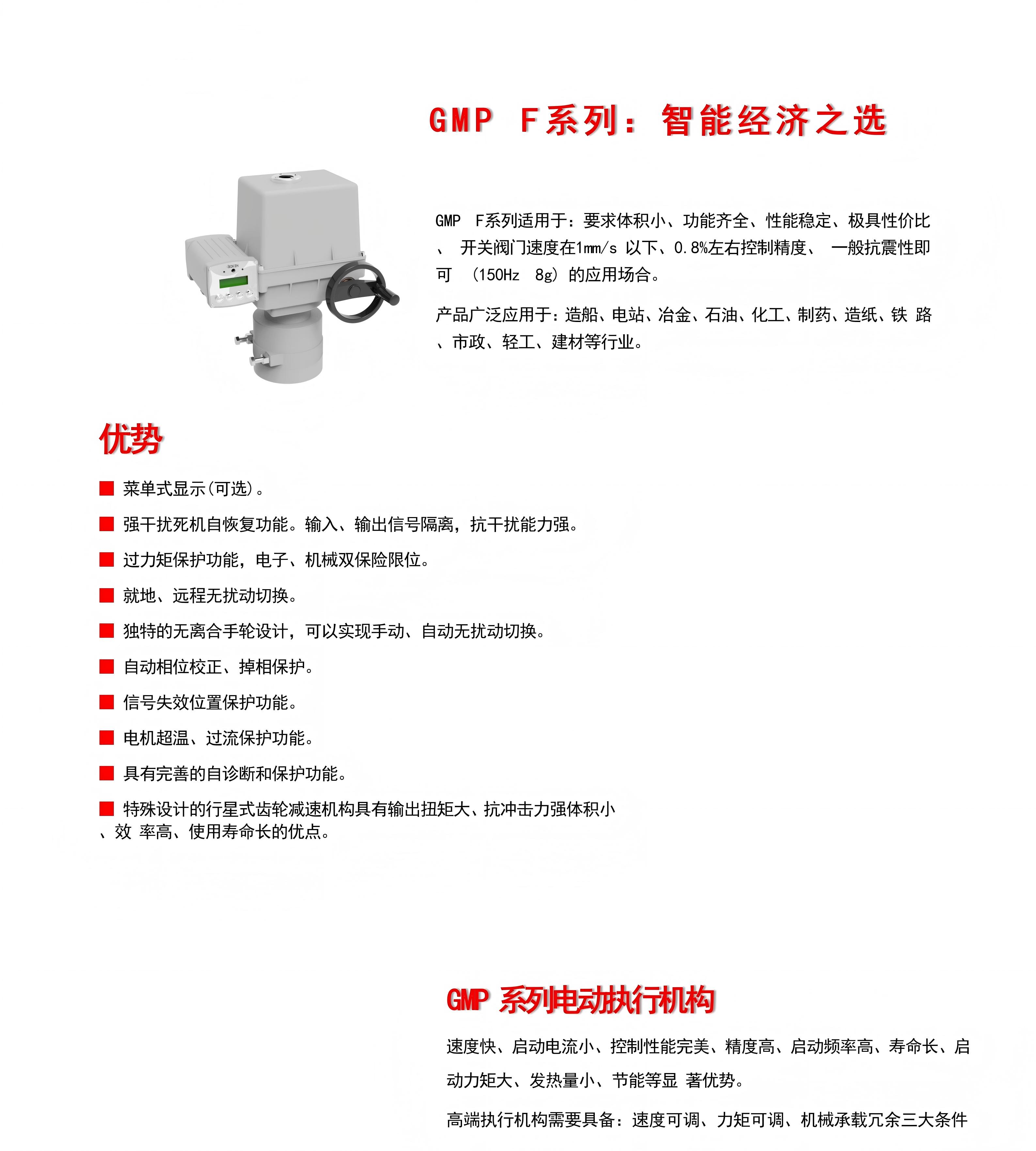 GMP-F系列其适用于:要求体积小、功能齐全、性能稳着 、极具性价比、开关阀门速度在 1mm/s以下 、0.8%左右控制精度 、一般抗震性即可(150Hz 8g)的场所。