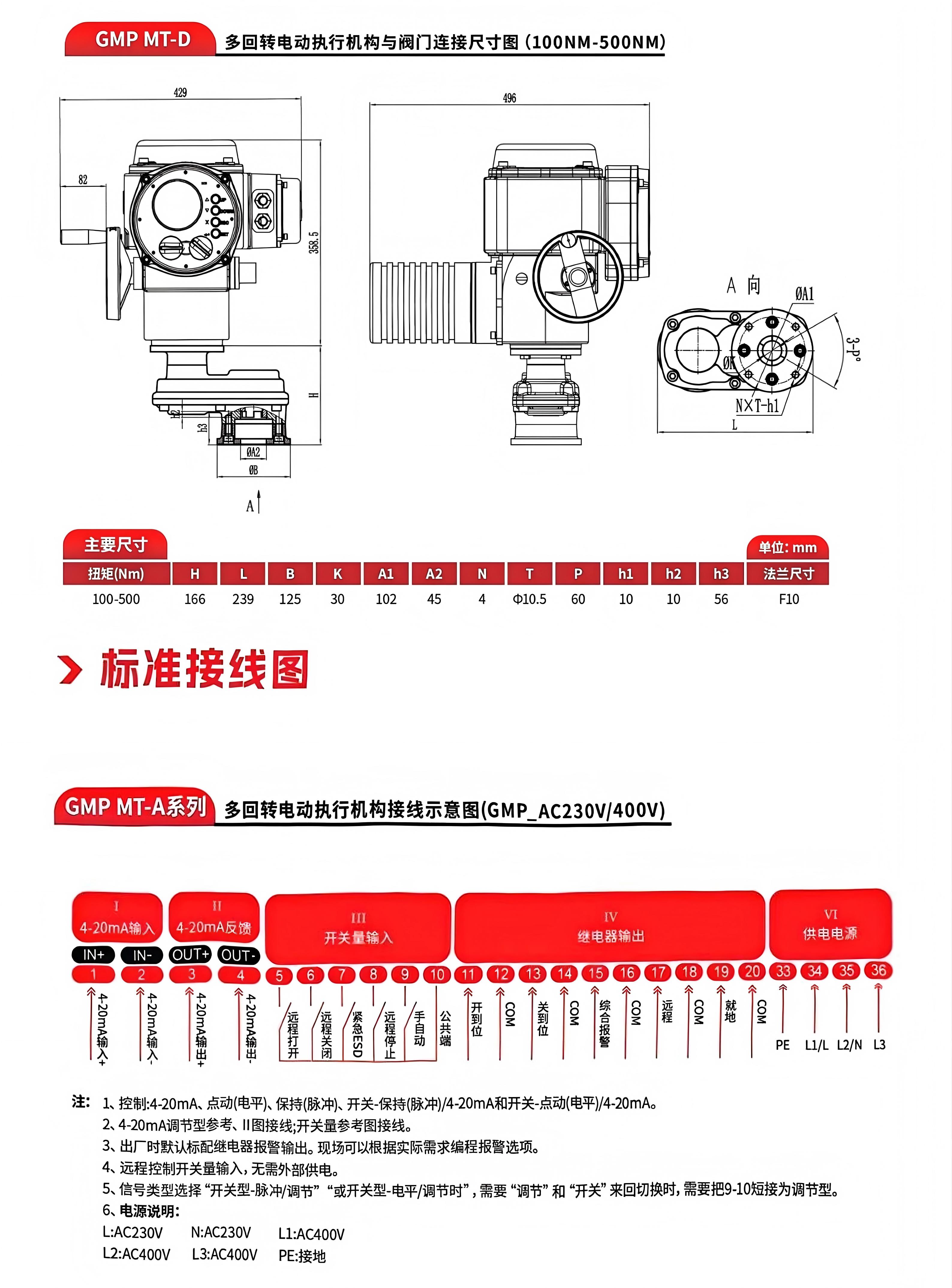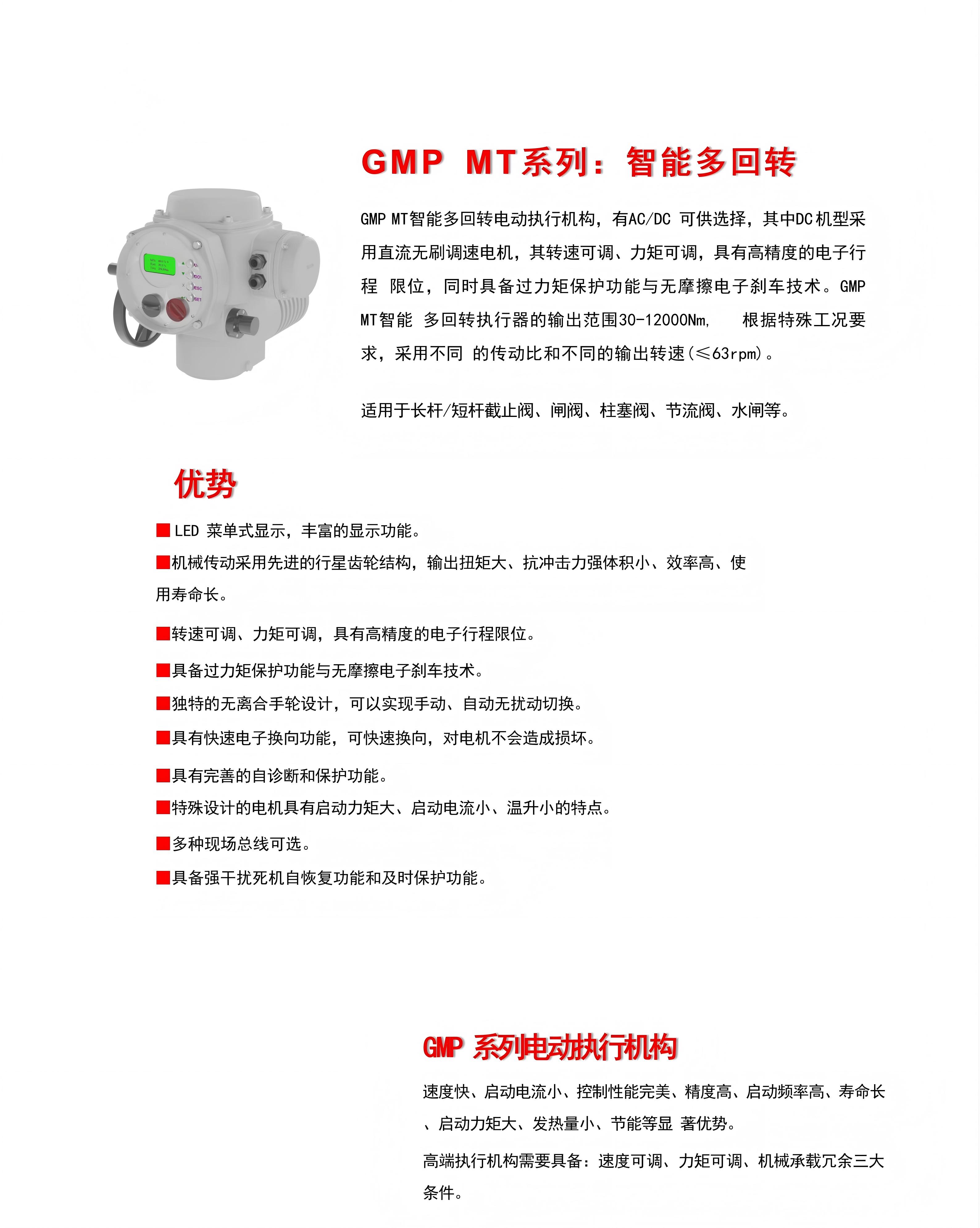 GMP-MT-A采用交流电机,具有高精度的电子行程限位,同时具备过力矩保护功能。GMP-MT供多回转执行器的输出范围30-12000Nm ,根据特殊工况要求,采用不同的传动比和不同的输出转速(≤63rpm)。