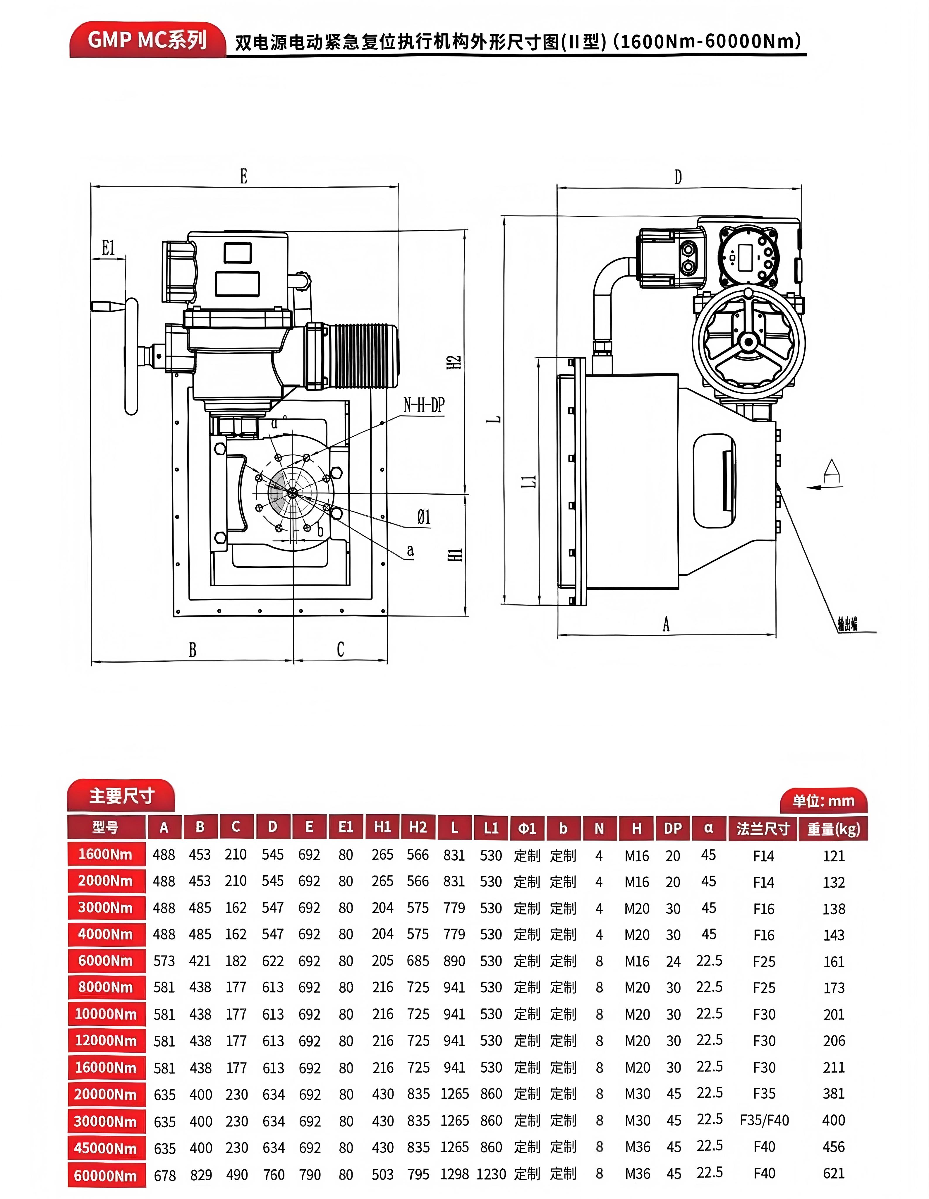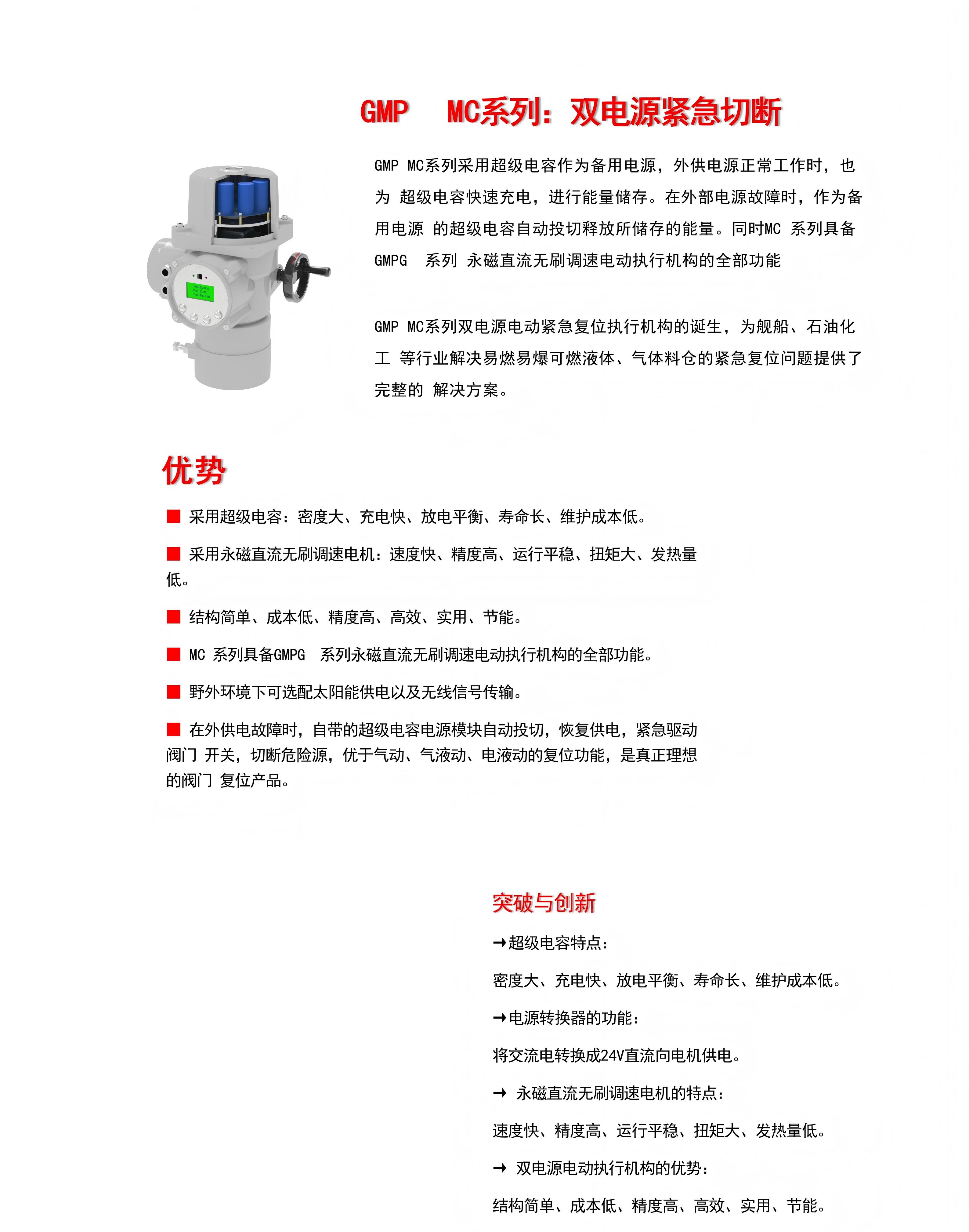 GMP MCH系列拥有超大的扭力扭矩,配合由超级电容为核心的双电源设计,极大的改善了传统电液动执行机构复杂、笨重、昂贵等弊端。