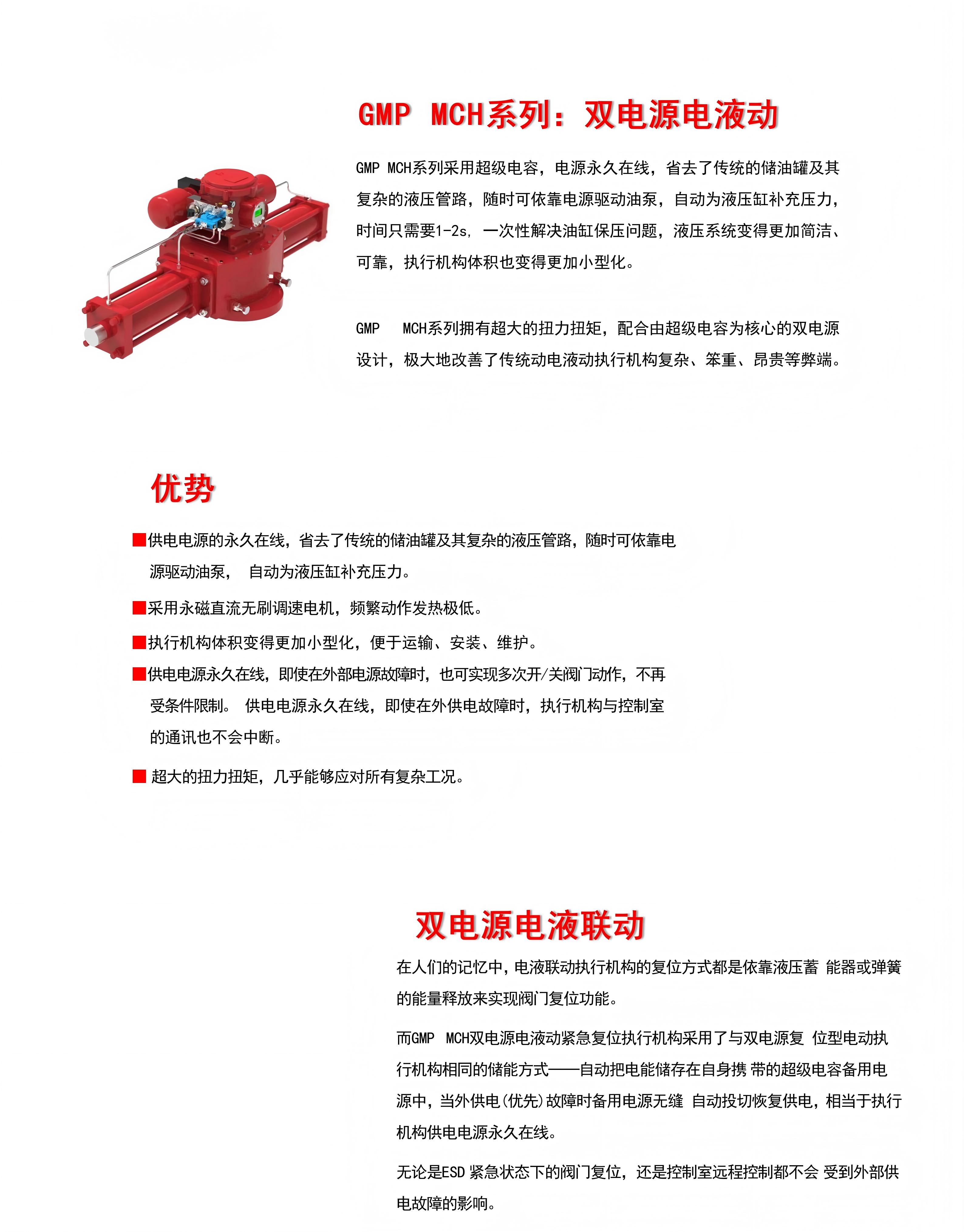 GMP MCH系列拥有超大的扭力扭矩,配合由超级电容为核心的双电源设计,极大的改善了传统电液动执行机构复杂、笨重、昂贵等弊端。